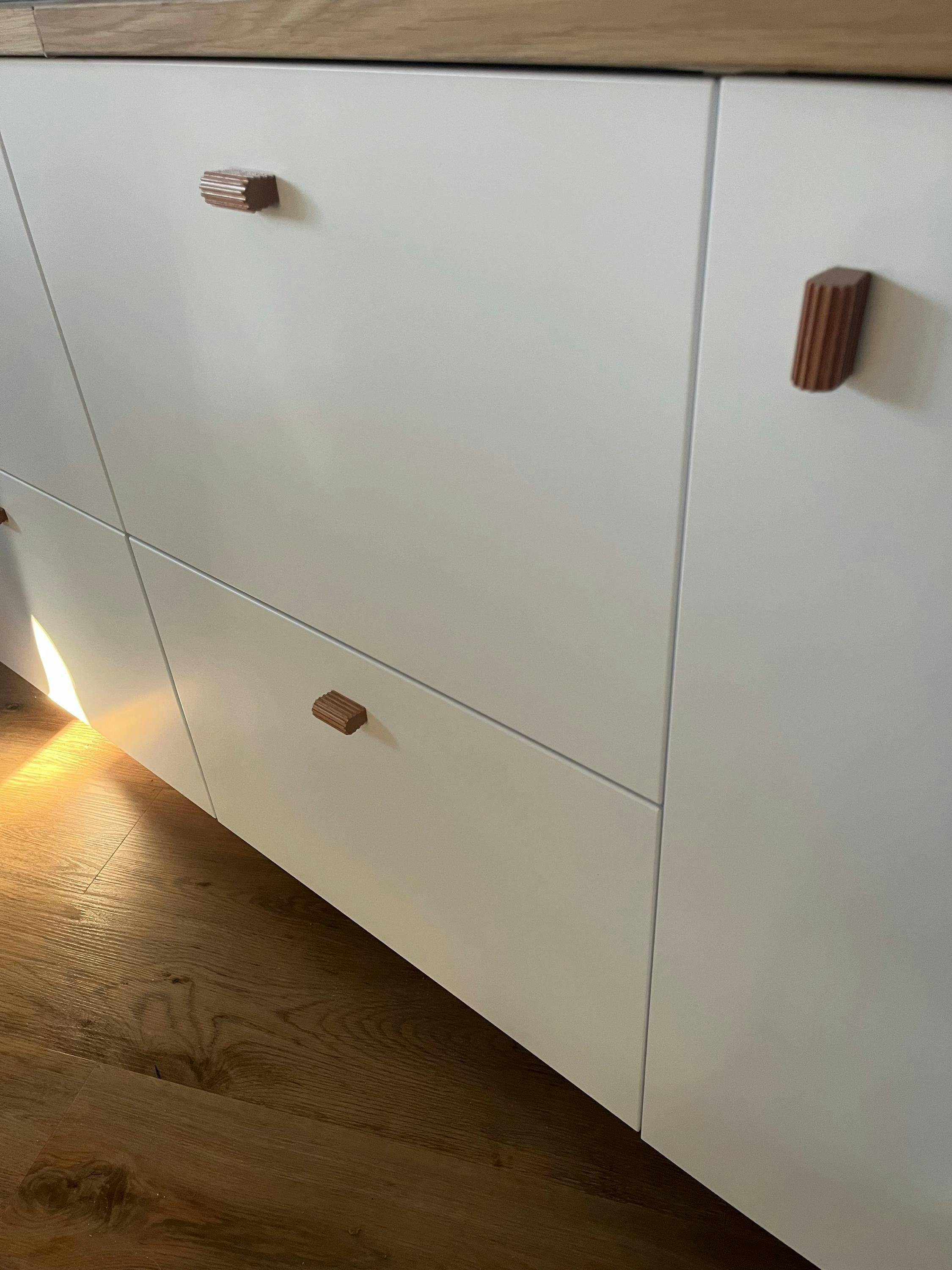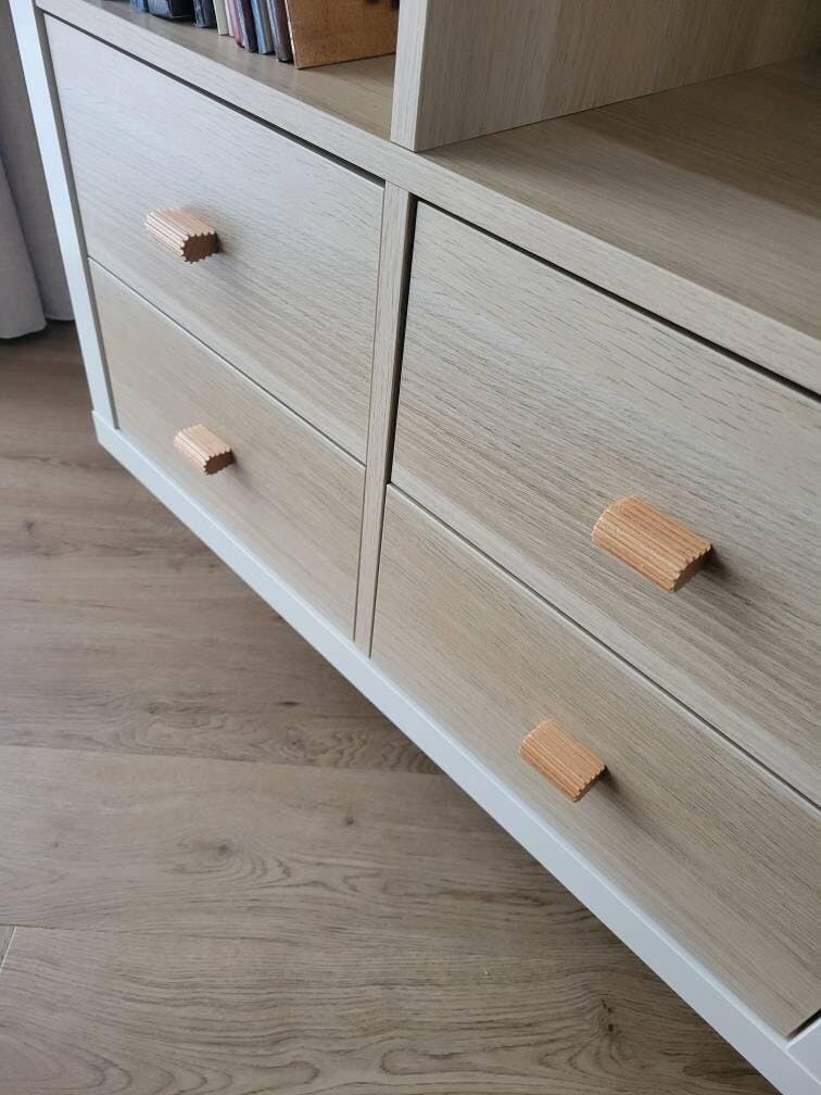 • The furniture drawer pulls and knobs are our registered design. They are made from beech wood and have a ribbed pattern. They use thin lines and have a minimalistic look that will enhance every piece of furniture: Ikea Kallax, Besta, Pax, IVAR, MALM, nightstands, kitchen cabinets, dressers or upper kitchen cabinets.